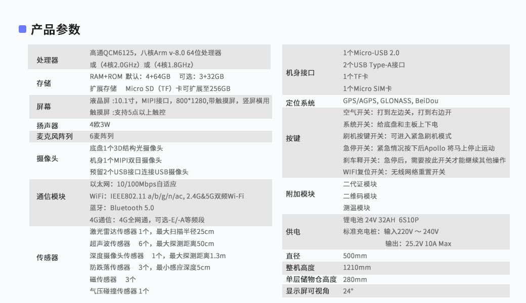 天波智能自动配送机器人R1 可以长时间续航,双层大容量储物仓,可以大容量装载,负重最大约为30kg,单层储物仓高度280mm,带仓门设计,确保物品配送不受外接污染。