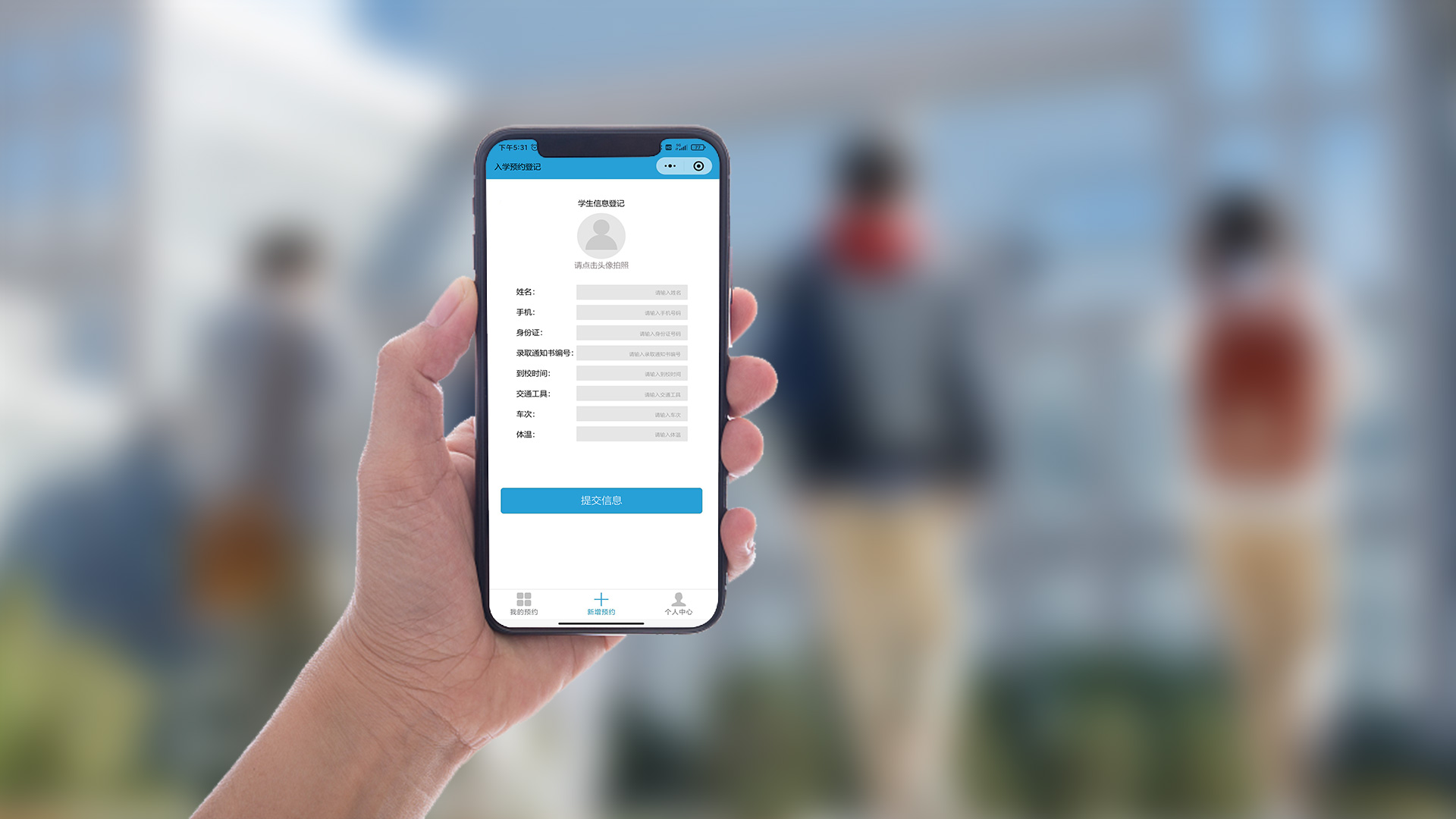 首先就是我们这个人脸识别门禁终端手机端的入学预约登记小程序,快速把姓名、电话、照片等信息录入进去,这个作用是什么呢?他的作用非常大,目的是为了可以监管学生后面入学登记的情况(包括姓名、手机、身份证、录取通知书编号、照片、到校时间、交通工具、车次、体温情况),这个手机预约可以为后面学生测温情况、入学登记与否都进行关联,且可以生成报表,可以解决迎新前如何采集新生14天健康信息数据的问题。这个是给大家介绍的第一个产品,这个小程序可以绑定到学校的公众号,学生很方便就可以找到入口,不需要下载app,非常方便有用。