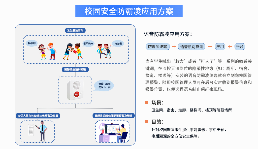 校园防霸凌雷竞技官方下载地址app 是当有学生喊出“救命”或者“打人了”等一系列的敏感关键词,在监控无法到位的隐蔽性地方(如:厕所、宿舍、楼道、楼顶等)安装的语音防霸凌终端就会立刻向校园管理报警,随即校园管理人员可在后台实时收到报警信息和报警位置,以便远程语音制止后赶来现场。
