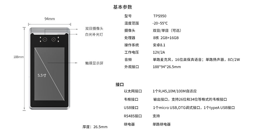 广东天波人脸识别门禁TPS950是由广东天波研发和生产的一款基于人脸识别算法应用的智能门禁终端,使用高级人脸识别算法,可选择单、双目摄像头,和开放接口给客户进行二次开发,帮助客户快速实现人脸识别功能。