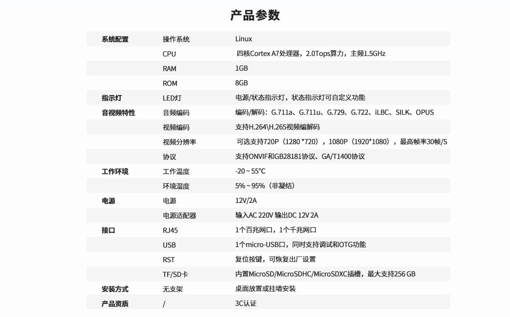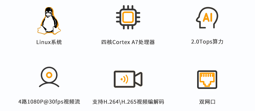 AI智能分析盒子采用linux操作系统,四核Cortex A7处理器,算力2.0Tops,主频1.5GHz;