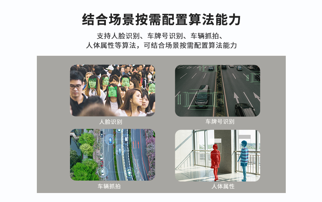 7、AI智能分析盒子支持人脸识别、车牌号识别、车辆抓拍、人体属性等算法,可结合场景按需配置算法能力