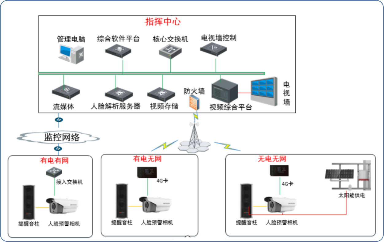 智能人脸摄像机、边缘网关(可选)、广播音柱、供电设备;