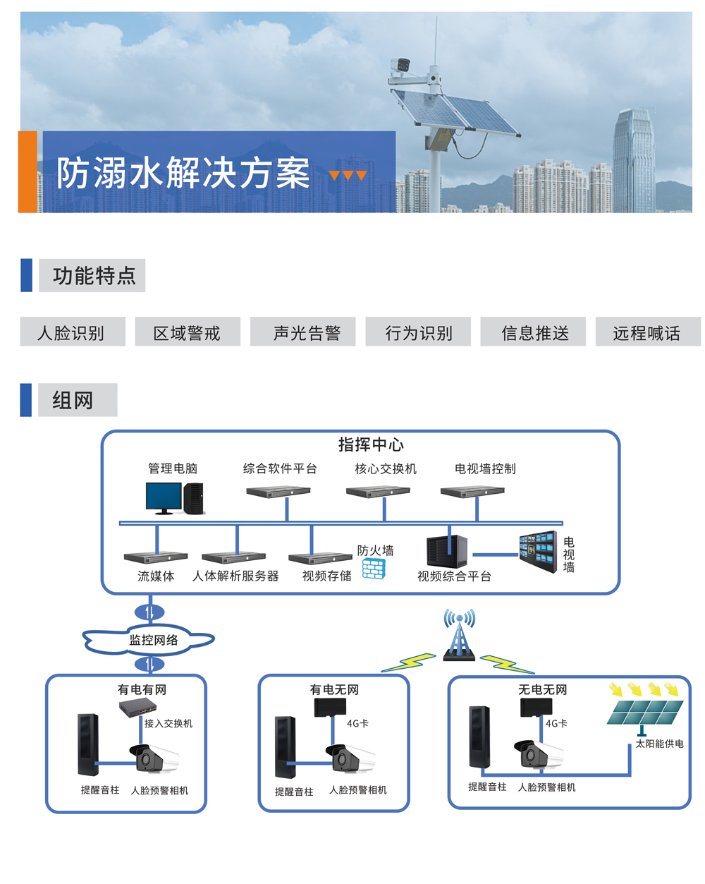 AI防溺水预警系统通过人脸识别、行为识别、区域警戒等多种AI算法进行24小时实时智能监控,实现自动识别人脸、自动触发区域报警、人工喊话告警和视频回看等功能,助力减少中小学生溺水事故的发生,实现智能化的危险水域安全管理。